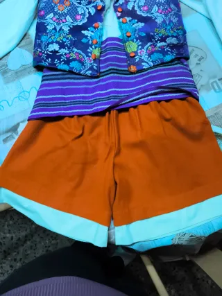 Conjunto de traje regional para niño, estilo saraguey fallero. De 5 a 8 años aproximadamente - Chaleco morado con bordados florales. - Camisa blanca. - Pantalón corto naranja con detalles. - Fajín o banda morada a rayas.