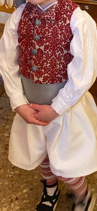Conjunto de traje de fallera para niño, incluye chaqueta y faldón,de 0 a 3 años - Chaqueta con estampado damasco. - Botones plateados decorativos. - Faldón blanco. - Cinturón gris. - Calcetines a rayas.