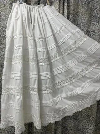 Enagua fallera de color blanco, con un diseño elegante y detalles de encajes y puntillas de bolillos. Tiene 1 metro de largo , con varias lorzas por si se tuviera que hacer mas larga y tiene la posibilidad de que sea más corta , porque la cintura está POR TERMINAR. Se termina con la medida de la cintura de la persona que la compre