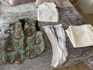 Traje fallero solo con una puesta. Incluye: - chaleco -camisa -calzon blanco - calzas -lliga cames -imperdible para fajin. -espardeñas opcionales talla 46. 10€ mas. - equivale a una talla S de hombre.