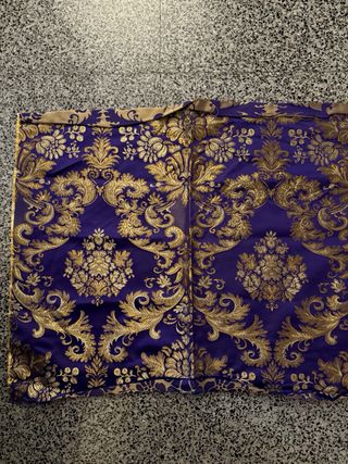Tela con un diseño tradicional fallero en tonos morados y dorados. Ideal para confección. - Tejido con estampado damasquinado. - Acabado brillante.