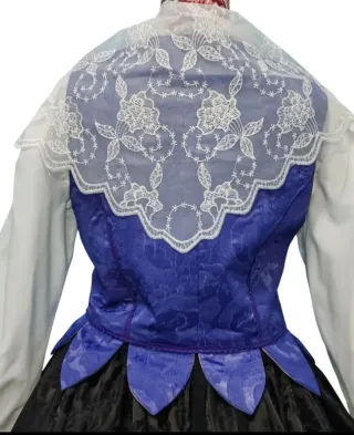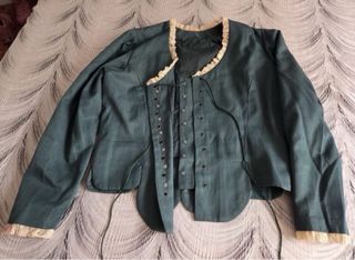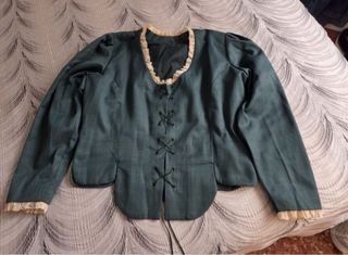 Precioso jubón artesanal de estilo baturra o fallera. - Diseño tradicional. - Cierre de lazada. - Mangas abullonadas. - Adorno de encaje en cuello y puños. Talla 42/44 Medidas de hombro a hombro 37cm, de sisa sisa 53cm