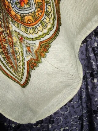 Pañuelo de estilo regional con un bonito estampado floral.medida 120"120 en algodon - Diseño con flores grandes y pequeñas. - Tonos beige y morado predominantes. - Ideal para complementar atuendos tradicionales. Baturra regional indumentaria maña jotera fallera valenciana huertana Lotes y envío económico y Wallapop envíos también consulta sin compromiso también probar posibilidad de compra en esenciaregional.com no negociable gracias
