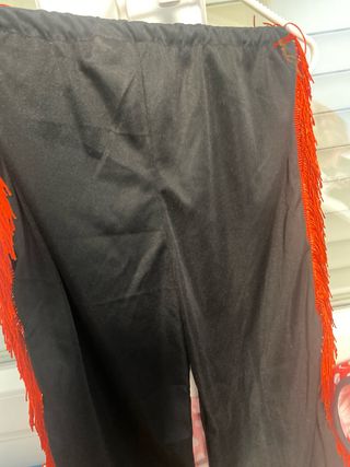 Disfraz de flamenco para niña, con un diseño vibrante y llamativo. - Chaqueta roja con lunares blancos. - Pantalón negro. - Detalle de volantes rojos en el lateral.
