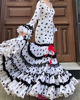 Traje de flamenca con un diseño clásico de lunares negros sobre fondo blanco. El vestido tiene mangas acampanadas y un volante en la parte inferior. - Diseño de lunares. - Mangas acampanadas. - Volante en el bajo.