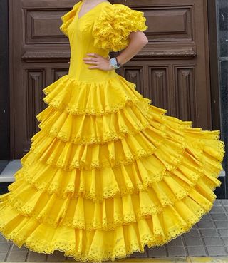 Traje de flamenca para alquilar, con un vibrante color amarillo. Lo alquilo por día,o 4 días por 50 euros. - Mangas con volantes. - Falda con múltiples volantes en cascada. - Diseño asimétrico con volantes.