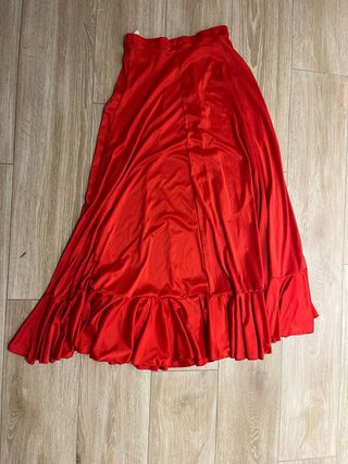 Falda larga para ensayo de baile flamenco. Diseño con volantes en el bajo. - Color rojo vibrante. - Tejido satinado. - Largo hasta el tobillo. - Cintura elástica.