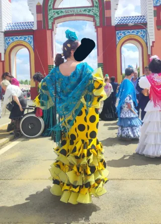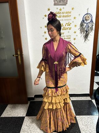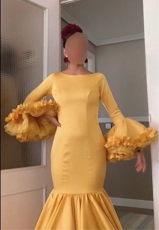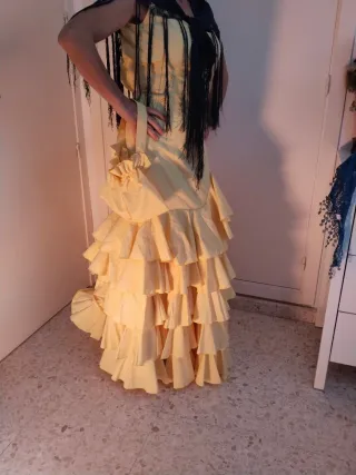 Vendo precioso traje de flamenca de gasa, color amarillo, muy elegante y favorecedor. Tiene manga larga con volantes, escote en pico y falda con volantes, que estiliza mucho la figura. ✔️ Talla 38/40 ✔️ Altura de la persona de la foto: 1,60 m ✔️ Tiene margen para sacar de las costuras ✔️ Tejido de gasa, ligero y con mucho movimiento ✔️ Usado en muy pocas ocasiones ✔️ En perfecto estado Ideal para feria, romerías y eventos flamencos.