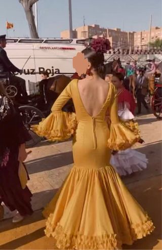 Traje de flamenca de color amarillo/mostaza, con un diseño elegante y llamativo. En muy buen estado. - Mangas largas con volantes. - Falda con volantes en el bajo. - Corte que realza la figura.