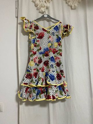Traje de flamenca con un vibrante estampado floral sobre fondo blanco y lunares negros. Diseñado con volantes y detalles en amarillo. - Estampado floral y de lunares. - Volantes en mangas y falda. - Ribete amarillo en cuello y volantes. -cosido a mano la falda no es larga asta bajo queda a media pierna o por la rodilla segun la altura de la niña talla desde una 6 asta 8 incluso 10 años -Tengo los complementos del pelo si lo encuentro y los regalaria