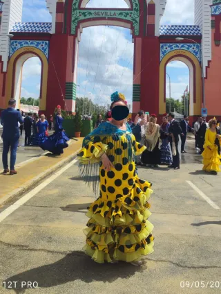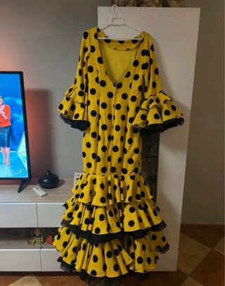 Traje de flamenca con un diseño llamativo y alegre. - Diseño de lunares negros sobre fondo amarillo. - Mangas acampanadas con volantes. - Falda con volantes.este si es un traje cómodo sin necesidad de quitar para poder ir al baño, ligero elegante y muy muy cómodo, mi medidas son 85 pecho 160 mido 95 caderas 60 cintura Costó 299 euros puesto 2 veces Vendo 160