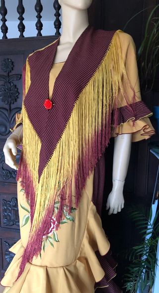 Precioso Traje de Flamenca y Mantoncillo del diseñador Paco Álvarez en color amarillo alvero y burdeos. Muy poco uso, casi Nuevo. Detalles de un traje de Flamenca de categoria como los colores de los flecos que es un difuminado con los colores del vestido; las mangas son de telas diferentes; preciosas enguas con encajes, tiras bordadas y bolsillo con cremallera... en fin es una Traje muy especial . Puede ser entre la talla 42 a 46 pero esto es a modo orientativo y sobretodo ANTES DE COMPRAR COMPROBAR LAS MEDIDAS: sisa 47,5 , cintura 42,5, caderas 54 , largo 145 cm. Además tiene muchísimo para ampliar tanto de ancho como de largo.