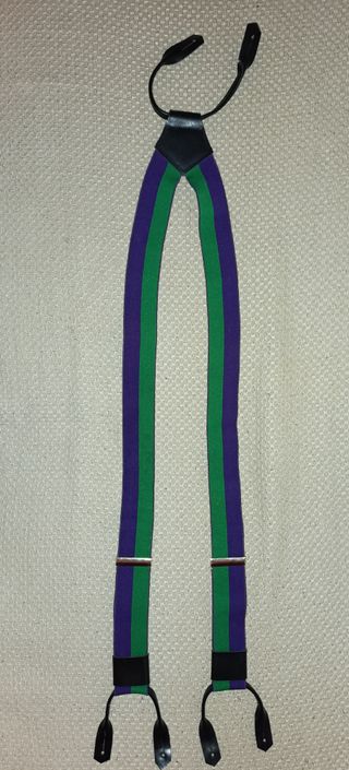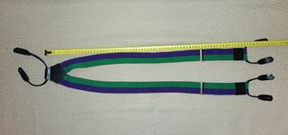 Tirantes de estilo rociero, flamencos o camperos. Son un accesorio llamativo y original. Talla única. Diseño a rayas verdes y moradas. Cierres de cuero negro. Ajustables.