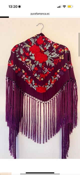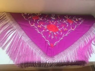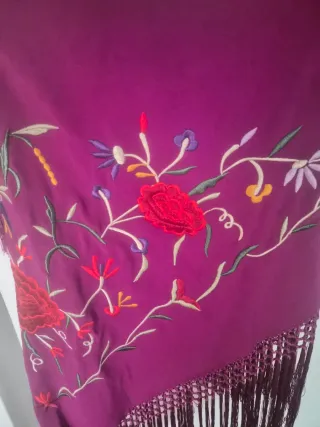Mantoncillo de flamenca con un diseño floral muy detallado y colorido. Perfecto para trajes de flamenca. - Bordado floral en tonos rojos y morados. - Flecos en el borde inferior. - Tejido de alta calidad. Sólo se ha usado 1 día.