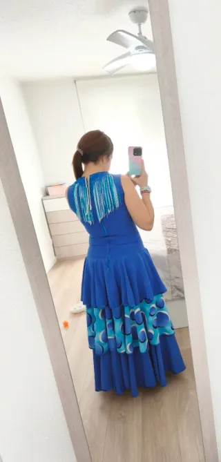 Vestido de flamenca con un diseño vibrante y detalles únicos. - Cuerpo ajustado con escote en V. - Adorno de flecos en el escote y hombros. - Falda con varios volantes. - Volantes inferiores con estampado de círculos en tonos azules. Esta sacado aproximadamente a una talla 40 y como se puede ver en la foto se le nota un poco la costura anterior( una vez puesto no se aprecia porque queda debajo del brazo) aun así se se le metiese de ancho volvería a quedar perfecto. De largo es para una persona de 1,63 más o menos. Si tienes cualquier duda con las medidas preguntame sin problema.