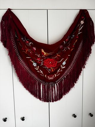 Mantoncillo de flamenca en color burdeos, con un precioso bordado floral y de aves. Burdeos bordado en colores. Cuerpo de crespón y flecos de poliéster. Bordado y flecado a máquina. 1,4 por 0,6. - Diseño con flecos largos. - Bordados detallados en hilo. - Ideal para trajes de flamenca.
