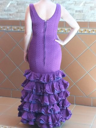 Traje de flamenca morado tela perforada, marca Micaela Villa, talla 42. Medias: Pecho 85cm Cintura 75cm Caderas 85cm Largo 1,50cm del hombro al suelo Tiene poco para sacarle. Regalo flor y flecos amarillos. Recoger en Bormujos