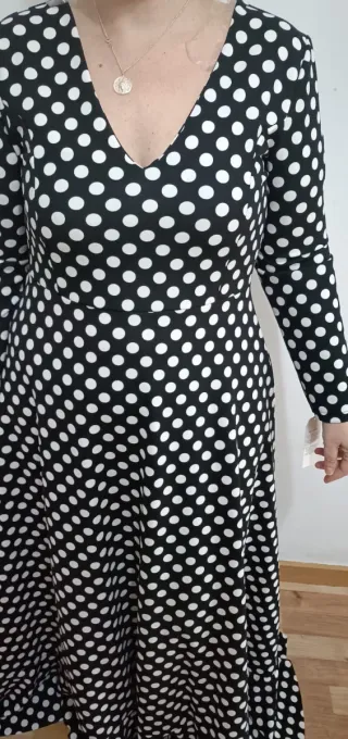 Traje de flamenca con un diseño clásico y elegante. Tiene para sacarle hasta la talla 40, es muy comodo, se adapta al cuerpo, se siente como no llevar nada y no da nada de calor. Tiene 1 dia de uso en la feria PRECIO NO NEGOCIABLE - Vestido blanco con lunares negros. - Escote pronunciado. - Mangas abullonadas. Mis medidas: Pecho : 80 Cintura: 63 Cadera: 94 Altura: 1.72 Instagram moda flamenca y trajes exclusivos: @maisonbelleamee