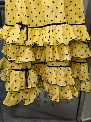 Traje de flamenca con un diseño clásico y elegante. - Estampado de lunares negros sobre fondo amarillo. - Mangas acampanadas con volantes. - Falda larga con múltiples volantes. 100 cadera. 85 pecho, 85 cintura Largo 1.45 Año 2022, puesto 2 veces