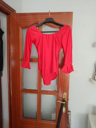Conjunto de falda y maillot para baile flamenco. - Falda larga roja con lunares blancos. - Volantes blancos en cascada en un lateral. - Maillot a juego.