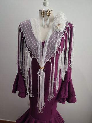 Traje de flamenca de color morado , nuevo con etiqueta, tejido licra que se adapta al cuerpo y queda precioso. Vale desde la 36 a la 42. Complementos aparte. - Chal blanco con lunares y flecos largos. - Adorno floral blanco en el hombro. - Pendientes largos blancos con detalles dorados. - Mangas acampanadas.