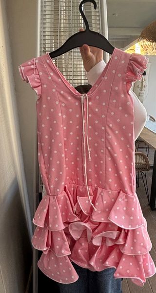 Vestido de flamenca con un diseño alegre y llamativo. Talla 18. Talla para aprox. 10 años - Estampado de lunares blancos sobre fondo rosa. - Volantes en las mangas y en la falda. - Cuello en pico con ribete blanco.