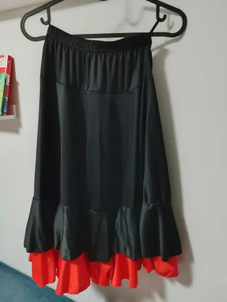 Falda flamenca con un diseño de dos capas. - Capa exterior negra con volantes. - Capa interior roja. - Cintura elástica. - La talla es aproximadamente talla 7-8(si tienen dudas puedo medir largo y contorno)