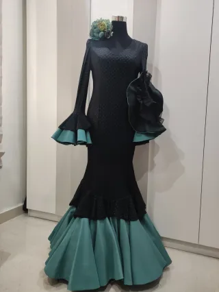 Elegante traje de flamenca largo, perfecto para cualquier ocasión especial. - Diseño de terciopelo en color verde azulado. - Adornado con detalles de flecos negros en el escote y la falda. - Mangas largas con volantes. - Corte que realza la figura.
