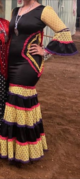 Traje de flamenca con corte canastero y carruchas con subida en pierna derecha color negro. Escote delantero de pico muy favorecedor y espalda normal. Cuenta con bolsillo interior con cierre de cremallera y enaguas efecto popelín. TEJIDO: 100% POLIESTER. No estira. Puesto dos veces Está nuevo Es súper cómodo Muchos volantes lo cual es voluminoso Precio negociable si se llega a un acuerdo Los complementos (flores y mantoncillo) también se pueden vender, precio aparte. Pregunta sin compromiso😊