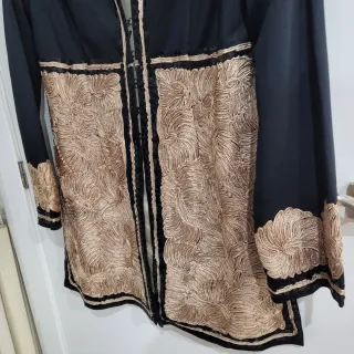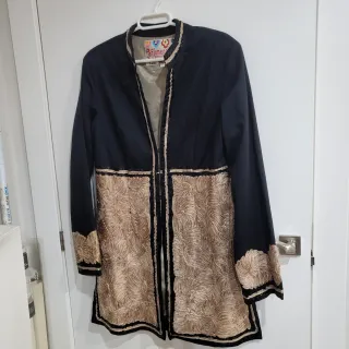Elegante chaqueta de la marca Flamenco con un diseño llamativo. - Detalle de bordado dorado en la parte inferior y mangas. - Ribete decorativo en el cuello y la apertura frontal. - Forro interior en tono dorado.queda muy bien puesta Se recoge en benimaclet Si compráis más cosas hago precio
