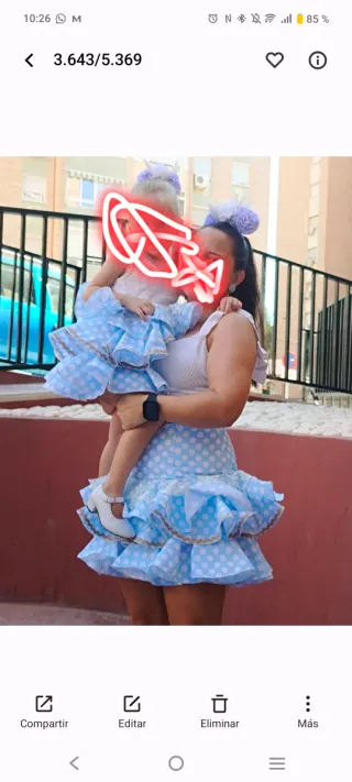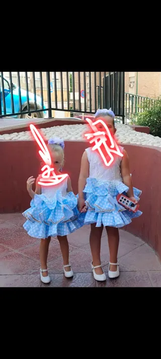Traje de flamenca para niña de 9 a 11 años aprox. con un diseño alegre y llamativo, perfecto para ferias y romerías. - Mangas con volantes escalonados. - Estampado floral sobre fondo azul claro. - Detalles en color fucsia. - pregunta por las medidas sin compromiso