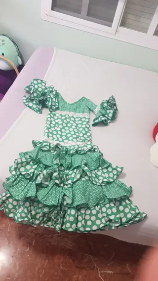 Vestido de flamenca o faralaes para niña. - Diseño con volantes. - Mangas con volantes.Para 3-4 años, tiene para sacarle se puede ver en una de las fotos, tiene unas leves manchitas que apenas se aprecian y se pueden tapar con el mantoncillo,