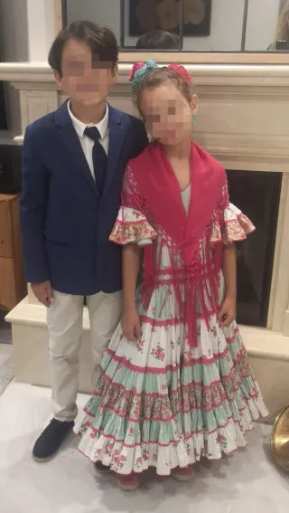 Vendo traje de flamenca para niña de 7-8 años. Confeccionado a mano con telas de alta calidad, de la tienda de tejidos Julián López. Es un diseño único. Se vende junto con el mantoncillo de la imagen y los complementos que aparecen en las fotos. Medidas: Largo: 107 cm Pecho 57 cm Cintura: 62 cm