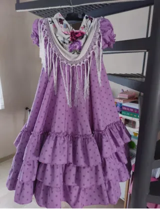 Conjunto de traje de flamenca para niña, ideal para fiestas y eventos.talla 7.8 tiene para sacar el mantocillo es beige echo a mano - Vestido morado con lunares. - Volantes en la falda. - Escote con puntilla blanca. - Pañuelo a juego con flores. - Incluye zapatos, pulseras, peine y pinza para el pelo.