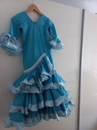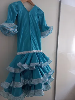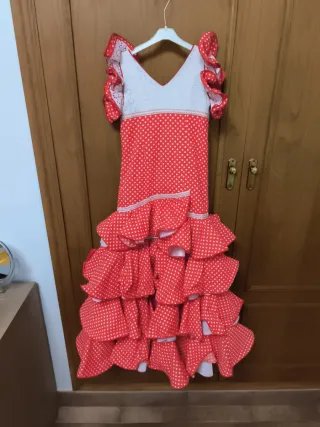 Traje de flamenca de Micaela Villa para niña de 7-8 años. Usado 1 dia. En muy buen estado. Tela muy agradable que pesa muy poco. con bolsillo. Medidas : largo desde el hombro 99cm ancho sisa a sisa: 27cm ancho caderas 29cm. tiene para sacar de largo unos 8cm. ancho 1cm.