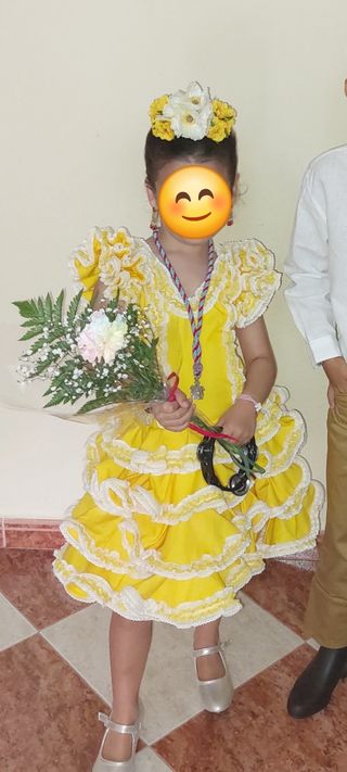 Precioso traje de flamenca para niña, con un diseño alegre y lleno de volantes. - Diseño de lunares amarillos sobre fondo blanco. - Mangas abullonadas con volantes. - Múltiples volantes en la falda. - Adornos de volantes amarillos en cada capa. Precio negociable
