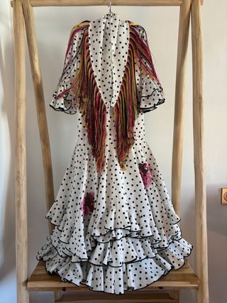 Vestido de flamenca original de la firma El Ajolí, diseño de Pepe Jiménez. Talla 6/7 años. ✨ Blanco con lunar negro clásico (atemporal y muy elegante). ✨ Manga con doble volante perfilado en negro. ✨ Volantes en cascada con mucho movimiento. ✨ Aplicaciones florales en rosa (se pueden quitar, ver fotos) ✨ Mantoncillo original a juego con flecos multicolor. Se realizó arreglo, por la misma tienda, bajando el talle cuando creció en altura. Es traje de firma, con estructura y caída de calidad. Es tendencia, mira Ajl 2026 en ig. Se vende conjunto completo (vestido + mantoncillo), preguntar si interesa solo una pieza. Negociable.