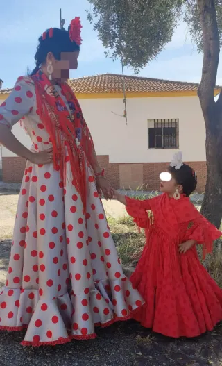 Conjunto de dos vestidos de flamenca, uno para adulto y otro para niña, con un diseño de lunares. - Vestido adulto T38 hecho a mano, tejido mikado. Beige con lunar coral oscuro - Vestido niña T2 Micaela villa. Coral con lunar coral y mantoncillo a juego Conjunto 250 Adulto 180 Niña 100