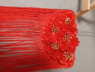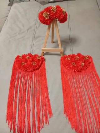 Preciosas hombreras para trajes de flamenca, adornadas con flores rojas y detalles dorados. - Diseño con flecos largos. - Adorno floral llamativo.