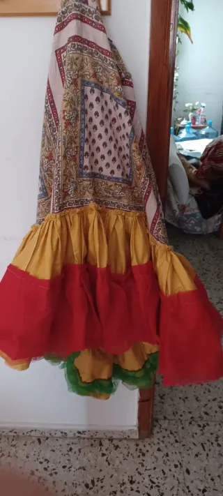 Traje de flamenca con un diseño vibrante y detalles llamativos,vestidos desde 30 a 45 y faldas de 20 a 30 euros - Mangas con volantes. - Cinturón con detalles azules. - Falda con múltiples volantes.