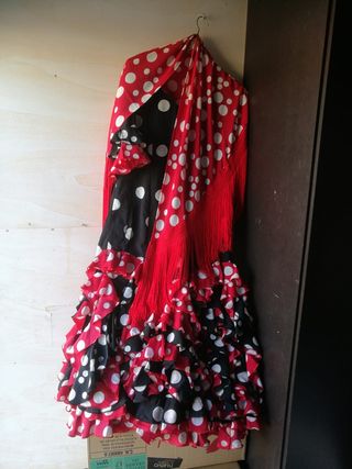 Se vende traje de flamenca en perfecto estado. Es la talla 44. Tiene bolsillo. Se vende con el mantoncillo. Tiene una sola puesta. Se puede ver y probar.