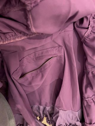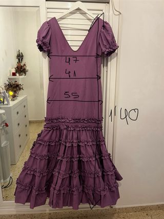Usado una vez. Hecho completamente a mano. Una talla 42-44. Medidas en la foto. Tiene costuras para sacarle y bajar o subir los volantes. También cuenta con bolsillo interior. Incluye flor del mismo color. Se aceptan ofertas