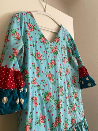 Color turquesa con lunares blancos de diferentes tamaños. Tiene bolsillo con cremallera en los volantes delanteros. Talla 44 aprox. Tiene costura para sacarle si se necesita más grande. Usado 1 feria. Cintura: 84cm Cadera: 96cm Contorno pecho: 90cm Largo: 1,40 cm