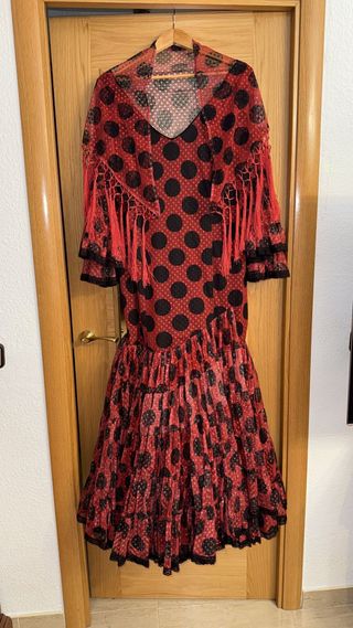 Traje de flamenca con un diseño vibrante y tradicional. Ha sido fabricado por una modista. Es talla 46 pero puede dar incluso 48, solo tiene 3 puestas. - Vestido largo con estampado de lunares. - Mangas con volantes. - Chal negro con flecos y bordado.