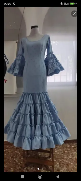 Traje de flamenca de color azul claro, con un diseño elegante y detalles de volantes. -usado dos veces solo - Mangas acampanadas con volantes. - Falda con múltiples volantes. - Diseño de lunares de terciopelo El traje está echo a medida equivale a una 42 ,44 de talla 142 cm de largo 90 cm de cintura Pecho 102 Cadera 110 Talle 78 Hombro 48cm Urge vender