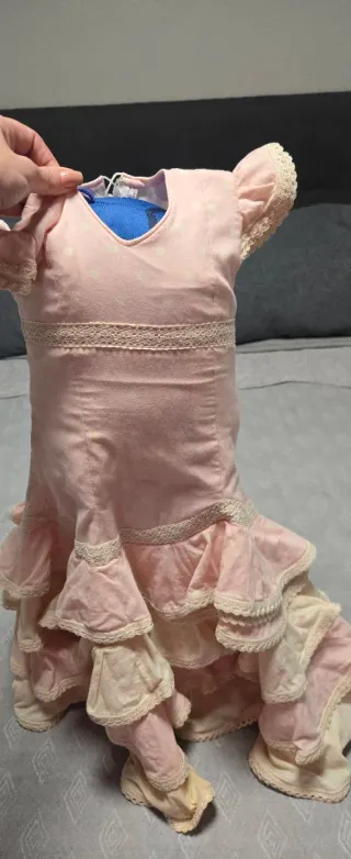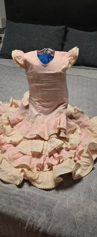 Traje de flamenca con volantes y encaje. - Diseño con múltiples volantes. - Adornos de encaje en mangas y falda. - Combinación de colores rosa y beige. - Hecho a mano y sus medidas son: - Contorno de pecho 48 -largo 64 Y tiene costuras, que tendrías tanto para sacarle como meterle.