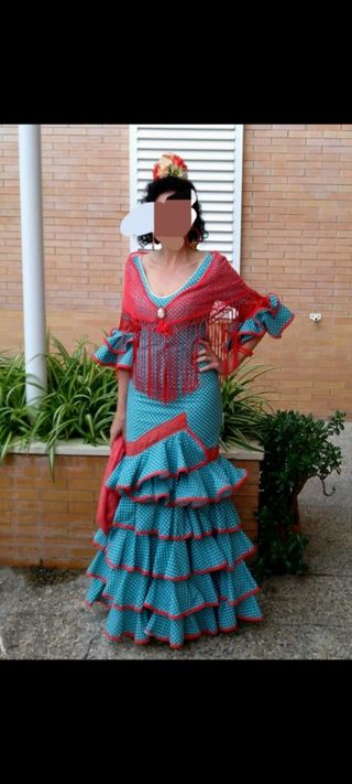 Traje flamenca hecho a medida en 2024,solo lo he usado dos veces, está prácticamente nuevo,se vende con todos los accesorios,mantoncillo bordado a mano en Cantillana,me costó una cantidad importante. Talla 46/48. El precio es con todo,traje y complementos,me costó muchisimo más .