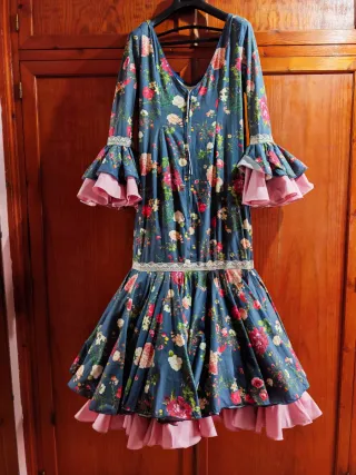 Traje flamenca mujer en tonos celestes. De fabricacion a medida, aunque pone talla 48, es tallaje pequeño, tiene en las costuras para sacarle. adjunto medidas largo de hombro a talle 89 cm largo total 1.45 cm ancho de pecho 50cm ancho de cadera 52cm