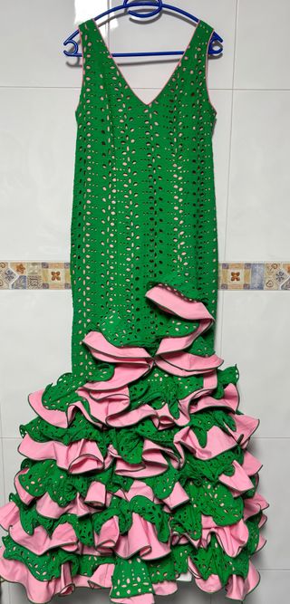 Traje de flamenca verde y rosa.
