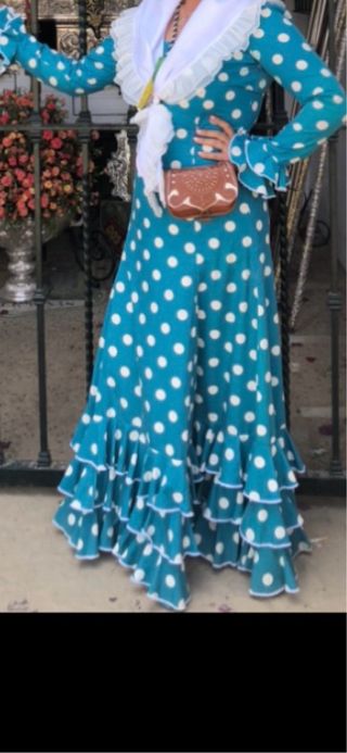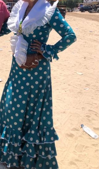 Traje de flamenca con un diseño clásico de lunares. - Diseño de lunares blancos sobre fondo verde azulado. - Volantes en la falda y mangas. - muy comodo, tela popelin, ideal ferias y romerias